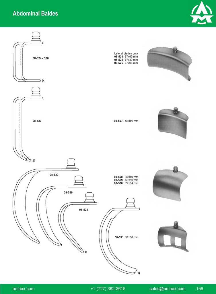 08-480 CASPAR Retractor, adjustable, consisting of: 5 medial blades, 5 Lateral blades. 08-480 A CASPAR Counter retractor, adjustable, consisting of: 5 blades. 08-481 40 x 23 mm 08-482 45 x 23 mm 08-483 50 x 23 mm 08-484 55 x 23 mm 08-485 60 x 23 mm Medial blades 08-486 40 x 23 mm 08-487 45 x 23 mm 08-488 50 x 23 mm 08-489 55 x 23 mm 08-490 60 x 23 mm Lateral blades 08-491 45 x 23 mm 08-492 50 x 23 mm 08-493 55 x 23 mm 08-494 60 x 23 mm 08-495 65 x 23 mm Blunt blades 08-496 50 x 25 mm 08-497 60 x 25 mm Blunt blades, for harvesting of the fusion graft from the iliac crest 08-498 40 x 25 mm 08-499 45 x 25 mm 08-500 50 x 25 mm 08-501 55 x 25 mm 08-502 60 x 25 mm Medial Titan blades semi transparent to x-ray 08-503 40 x 25 mm 08-504 45 x 25 mm 08-505 50 x 25 mm 08-506 55 x 25 mm 08-507 60 x 25 mm Lateral Titan blades semi transparent to x-ray 158