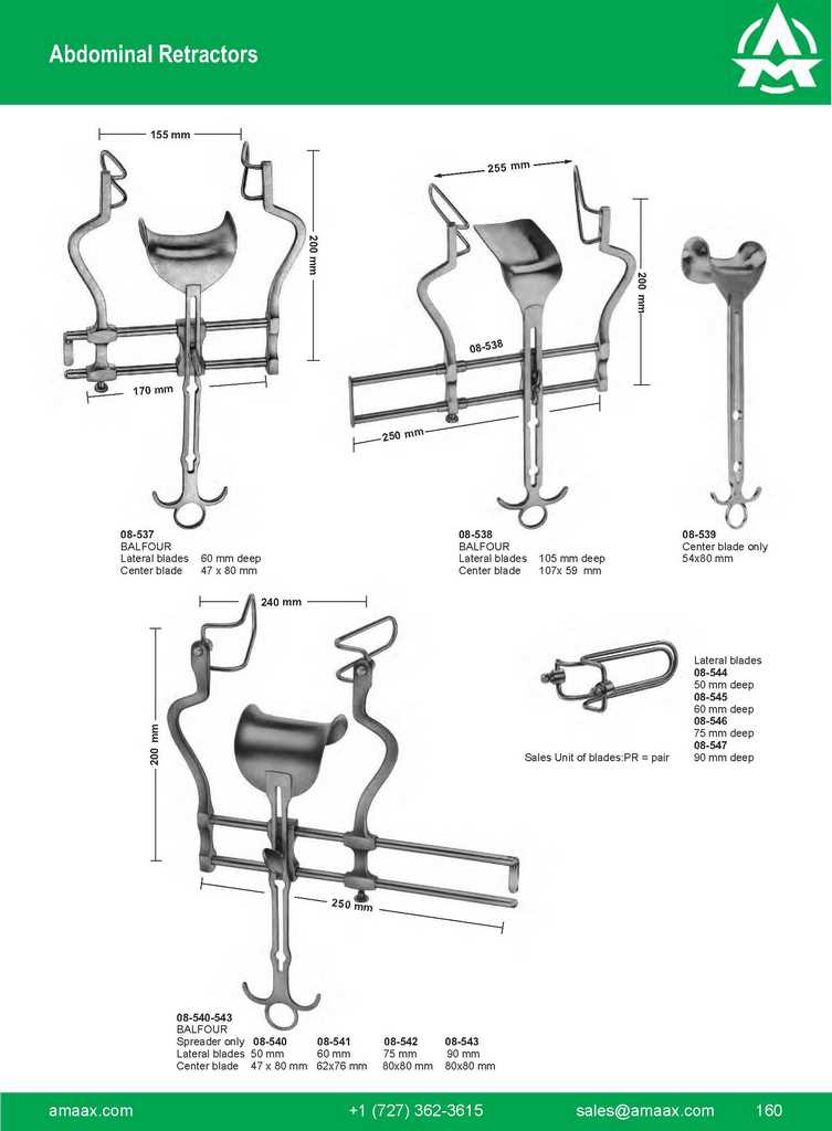BABY-COLLIN with 2 pair of blades 90 mm 24 mm 42 mm 08-513 COLLIN complete 135 mm 37 mm 62 mm 08-514 – 518 COLLIN complete 08-817 135 mm 08-818 160 mm Spreader only 08-514 08-515 08-516 Lateral blade 37x62mm 37x80mm 37x98mm Canter blade 54x55mm 54x67mm 52x76mm 210 mm 08-519 – 520 RICARD complete Spreader only 08-519 08-520 Lateral blade 58x80mm 72x84mm Canter blade 54x70mm 72x90mm 08-521 – 523 HOLZBACH Complete 08-521 Spreader only 08-522 Lateral blade 59x80mm 08-523 Canter blade 74x82mm 275 mm INSTRUMENTS R 160