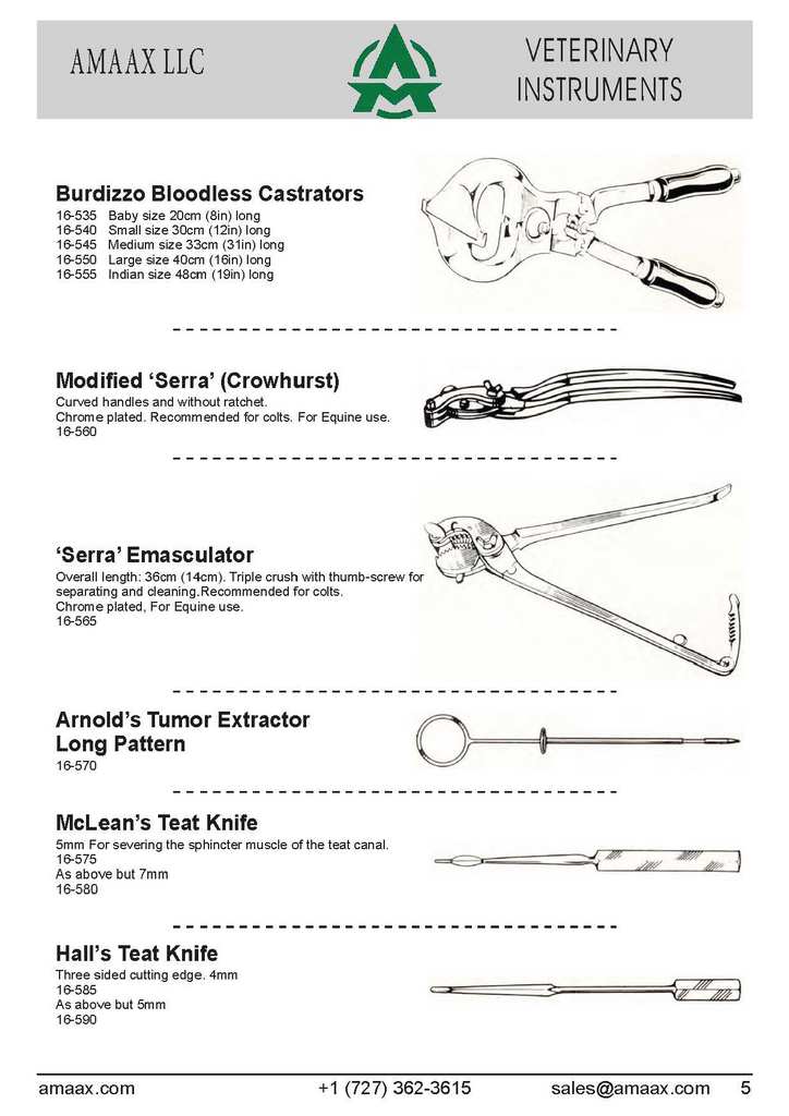 Burdizzo Bloodless Castrators 16-535 Baby size 20cm (8in) long 16-540 Small size 30cm (12in) long 16-545 Medium size 33cm (31in) long 16-550 Large size 40cm (16in) long 16-555 Indian size 48cm (19in) long Modified ?Serra? (Crowhurst) Curved handles and without ratchet. Chrome plated. Recommended for colts. For Equine use. 16-560 ?Serra? Emasculator Overall length: 36cm (14cm). Triple crush with thumb-screw for separating and cleaning.Recommended for colts. Chrome plated, For Equine use. 16-565 Arnold?s Tumor Extractor Long Pattern 16-570 McLean?s Teat Knife 5mm For severing the sphincter muscle of the teat canal. 16-575 As above but 7mm 16-580 Hall?s Teat Knife Three sided cutting edge. 4mm 16-585 As above but 5mm 16-590