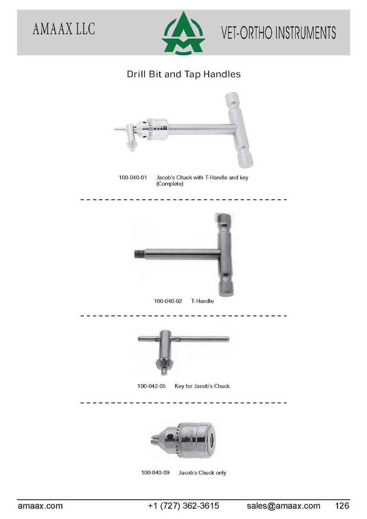 Drill Bit and Tap Handles 100-040-01 Jacob?s Chuck with T-Handle and key (Complete) 100-040-02 T-Handle 100-042-05 Key for Jacob?s Chuck 100-040-09 Jacob?s Chuck only